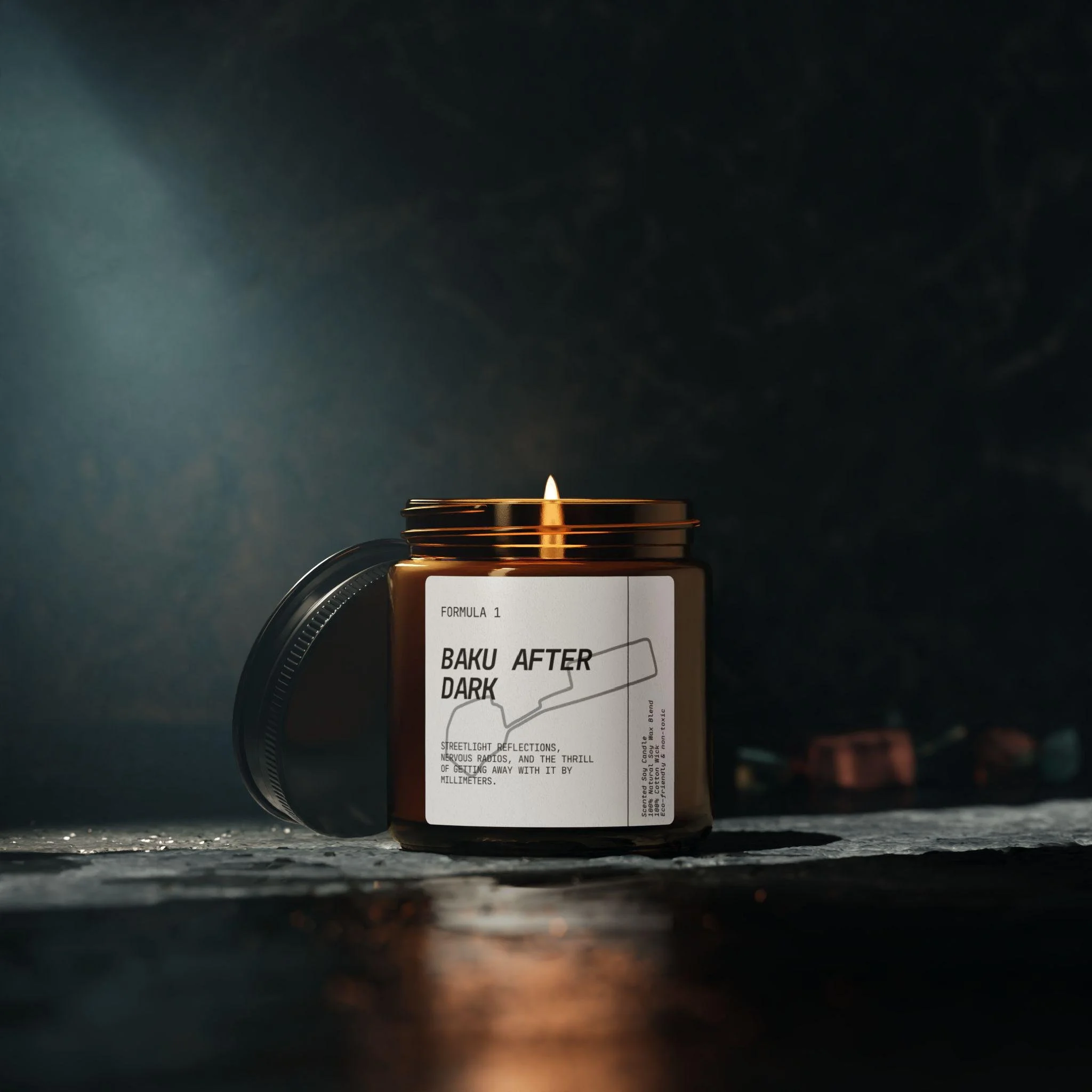 Warm amber glass, clean label, and a slow-burning soy wick - this candle captures the atmosphere of a night on the circuit. Each scent is inspired by the cities, circuits, and sensations of Formula 1: from the high-octane dusk of Baku After Dark to the crisp, alpine air of Monaco Morning, the humid charge of Singapore Heat, or the grounded calm of Silverstone Rain.