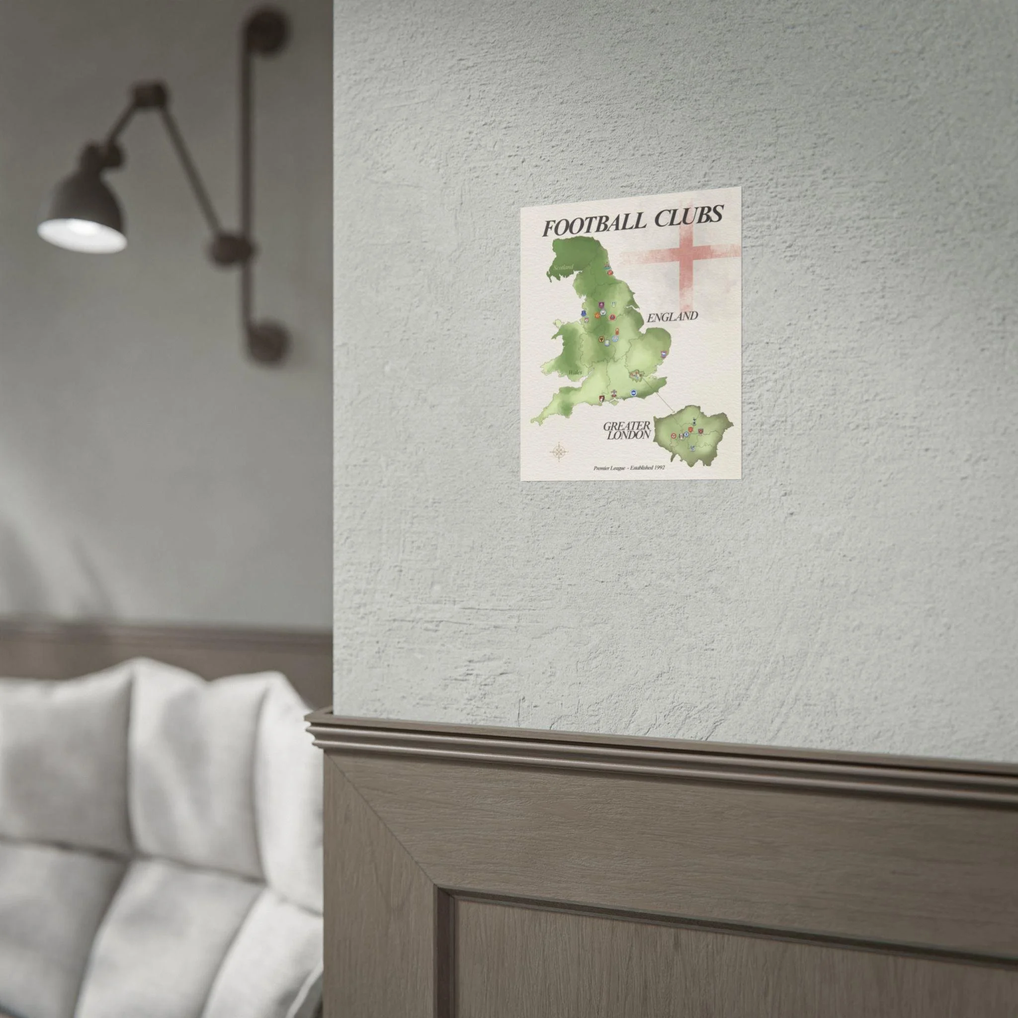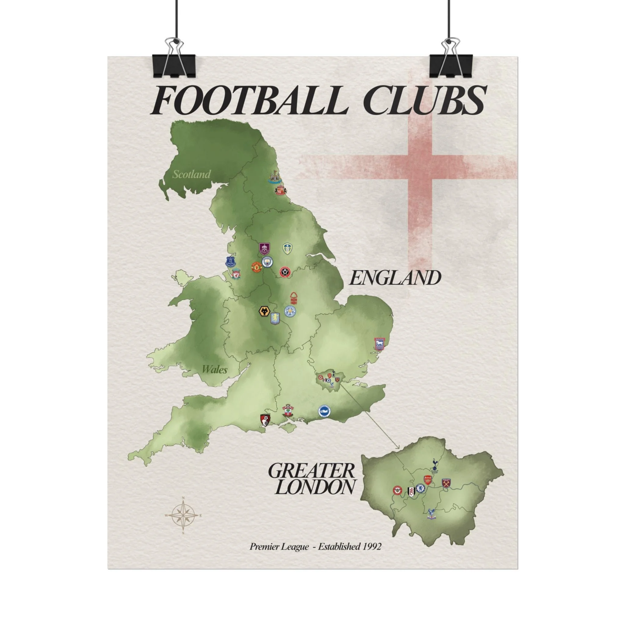 A rolled art poster that maps English football clubs with a vintage, watercolor feel — printed on archival-quality papers that bring out soft textures or crisp photographic detail depending on your choice. This poster feels like a worn travel map found in a coach’s office: muted greens form the country and Greater London inset, tiny club badges dot key cities, and a faded St. George’s Cross drifts behind the composition. It settles easily into a study, fan cave, or hallway and invites quiet revisits — tracing rivalries, remembering matchday journeys, or marking hometown pride.